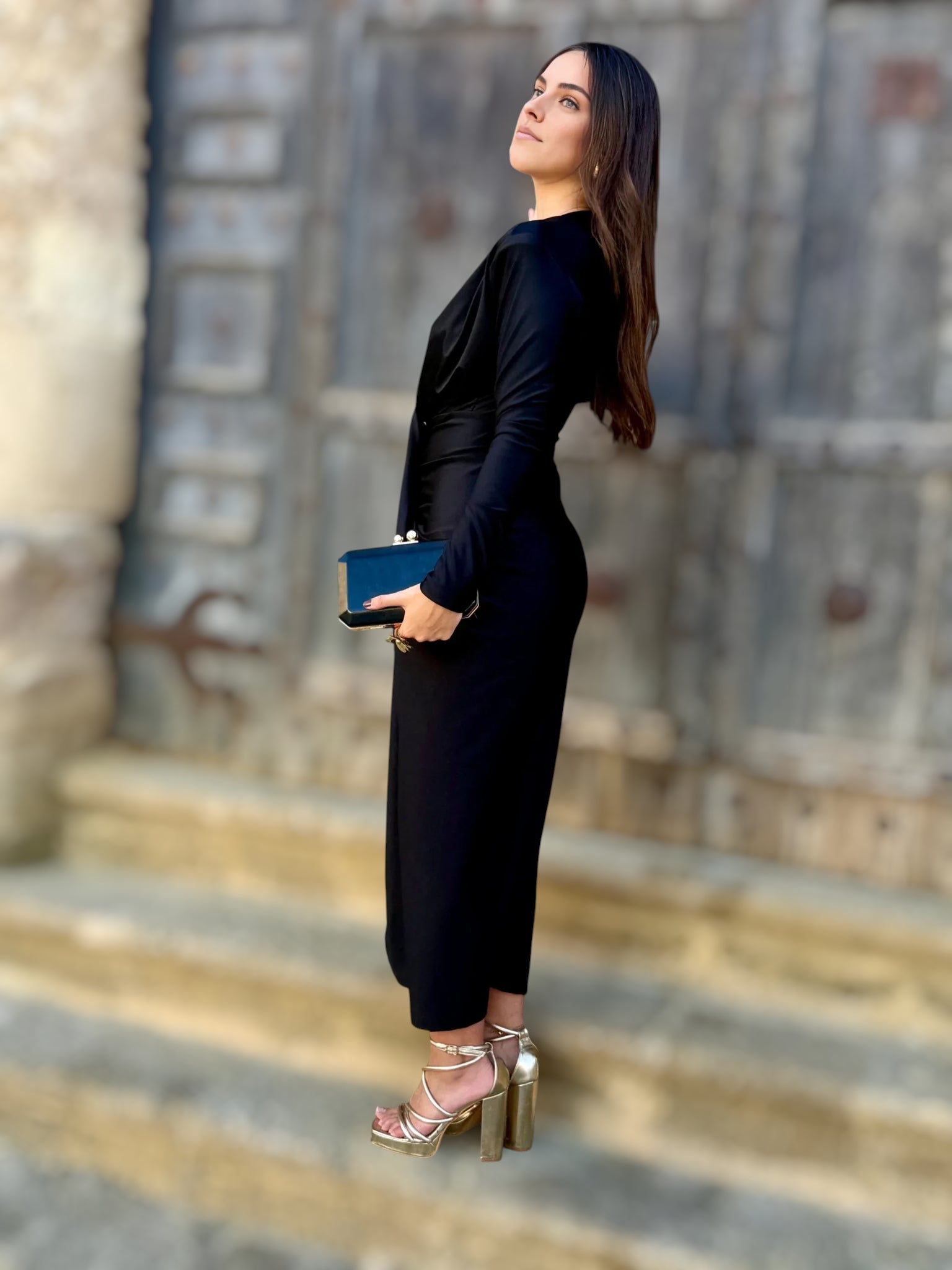 Confeccionado en un tejido suave y ligeramente elástico, este vestido largo ofrece una caída fluida que acompaña los movimientos con naturalidad. La abertura delantera en la falda añade dinamismo y un aire sofisticado, ideal para lucir en eventos tanto de día como de noche.