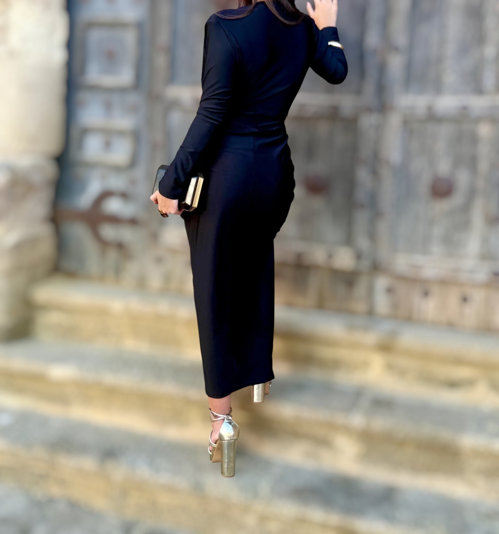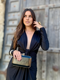 El Vestido Marta color negro es una prenda que combina elegancia y modernidad en una silueta envolvente y favorecedora. Su escote profundo en pico aporta un toque de sensualidad equilibrada, mientras que el frunce central define la cintura y realza la figura con un efecto visual estilizador.