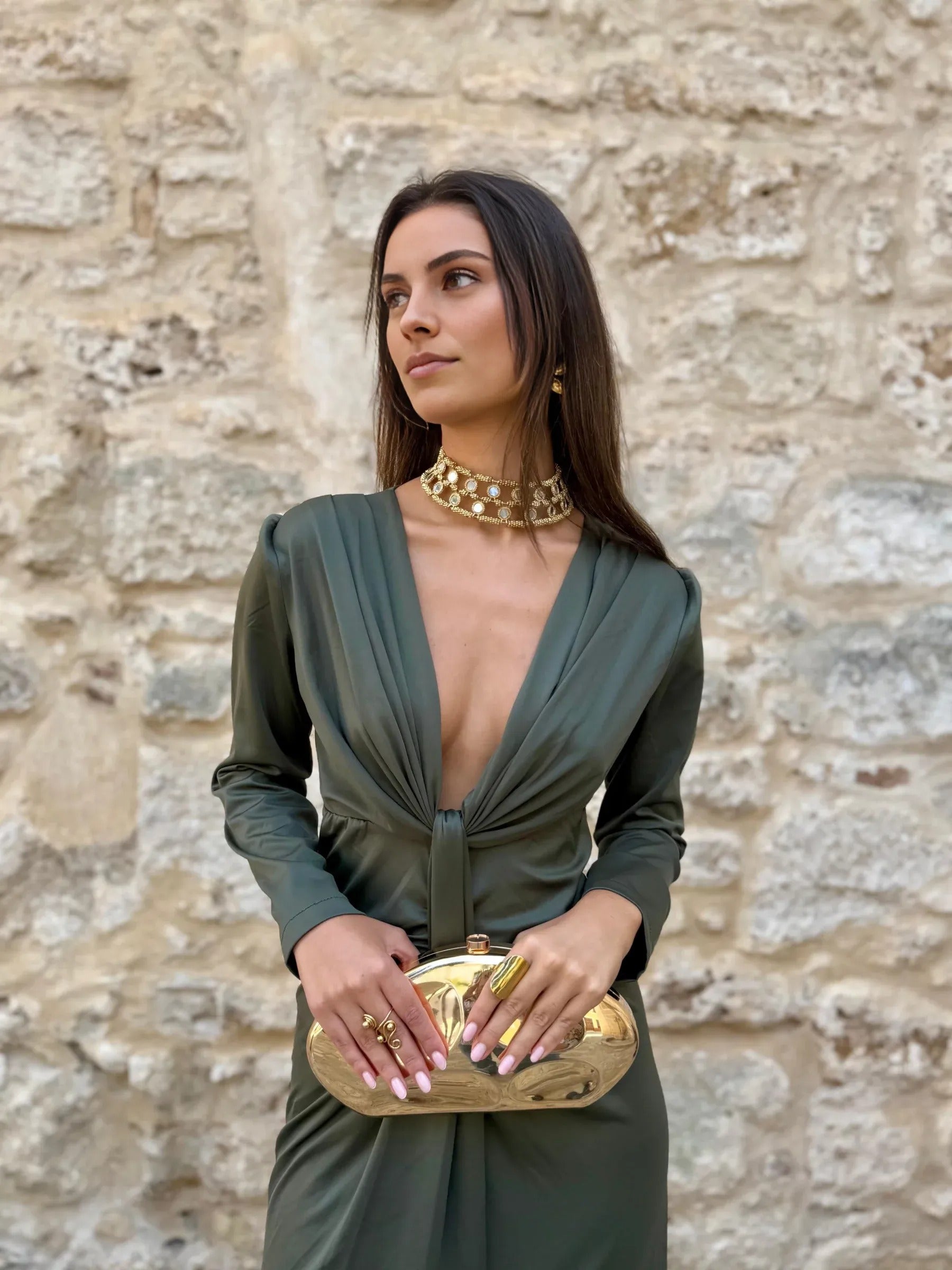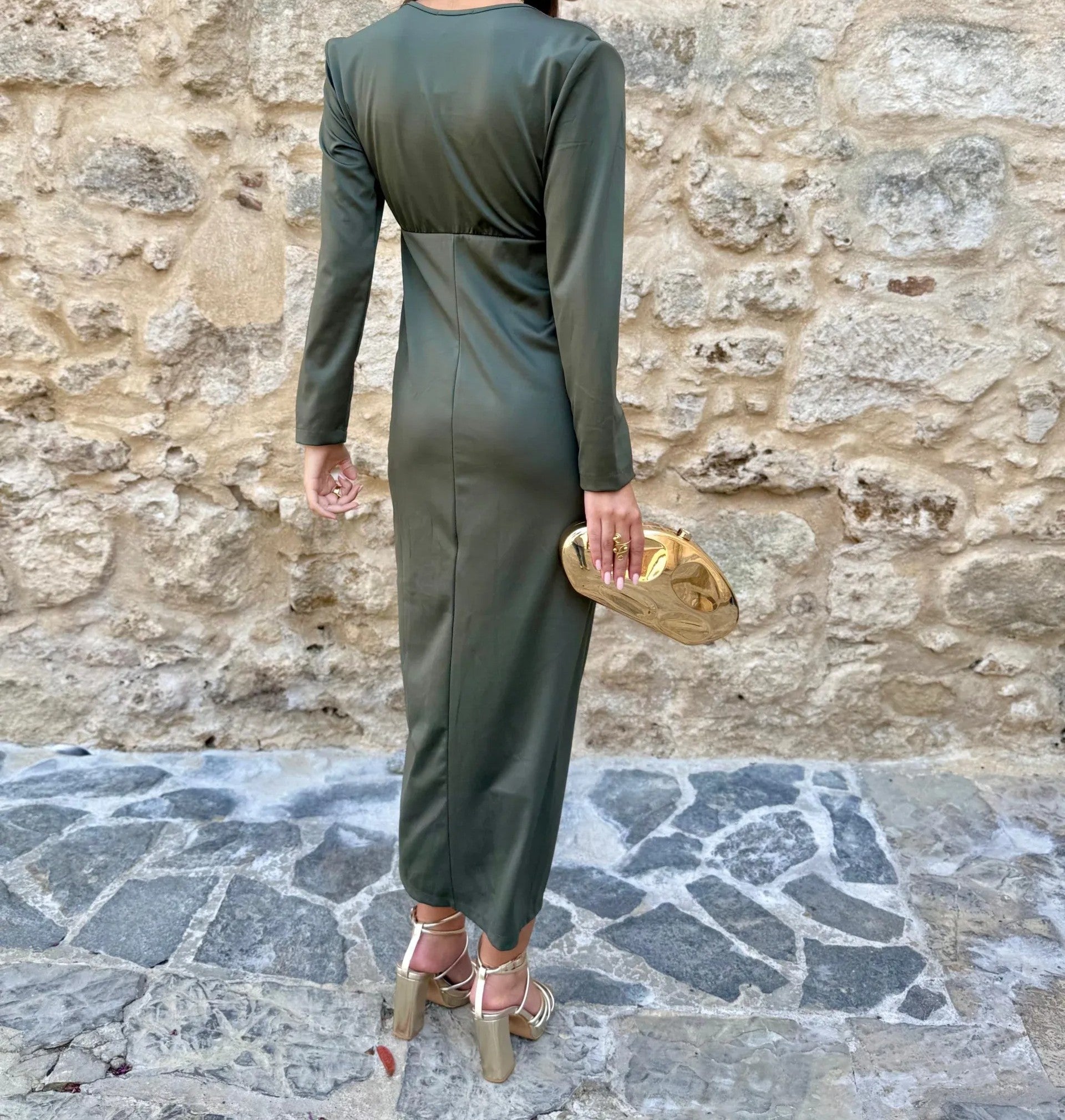 El Vestido Marta color verde es una prenda que combina elegancia y modernidad en una silueta envolvente y favorecedora. Su escote profundo en pico aporta un toque de sensualidad equilibrada, mientras que el frunce central define la cintura y realza la figura con un efecto visual estilizador.