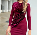 El Vestido Mónica Burdeos es una prenda sofisticada y elegante que combina estructura y suavidad en un diseño muy favorecedor. Su corte entallado con frunce lateral realza la silueta de manera sutil, mientras que el drapeado de terciopelo en el pecho y la cintura aporta textura, profundidad y un aire refinado.