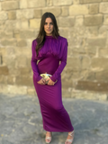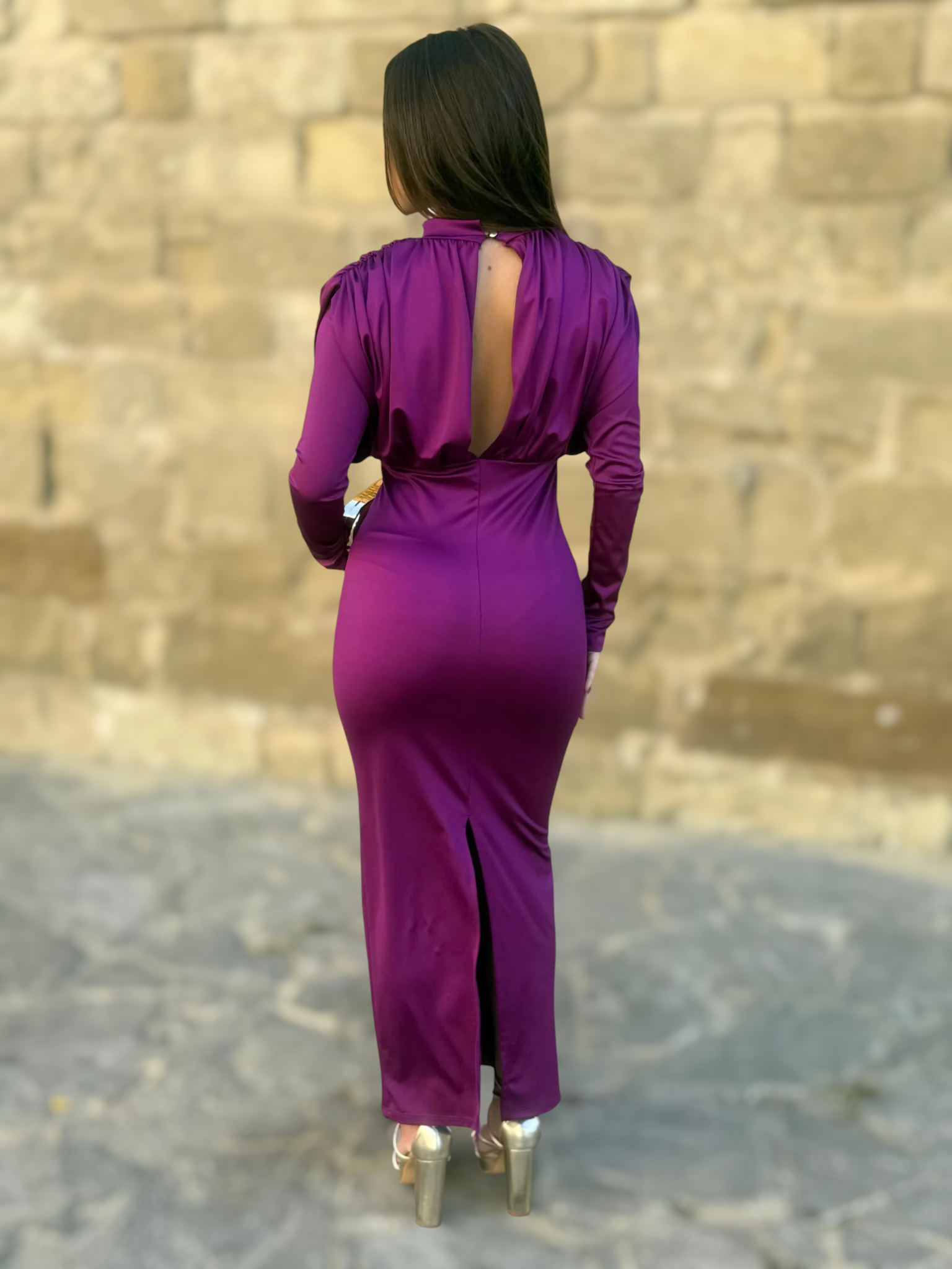 Confeccionado en un tejido con cuerpo y ligera elasticidad, se adapta perfectamente al cuerpo manteniendo la comodidad y el estilo. Las mangas largas y el corte entallado alargan la silueta, mientras que el largo hasta el suelo lo convierte en una opción ideal para eventos tanto de día como de noche.