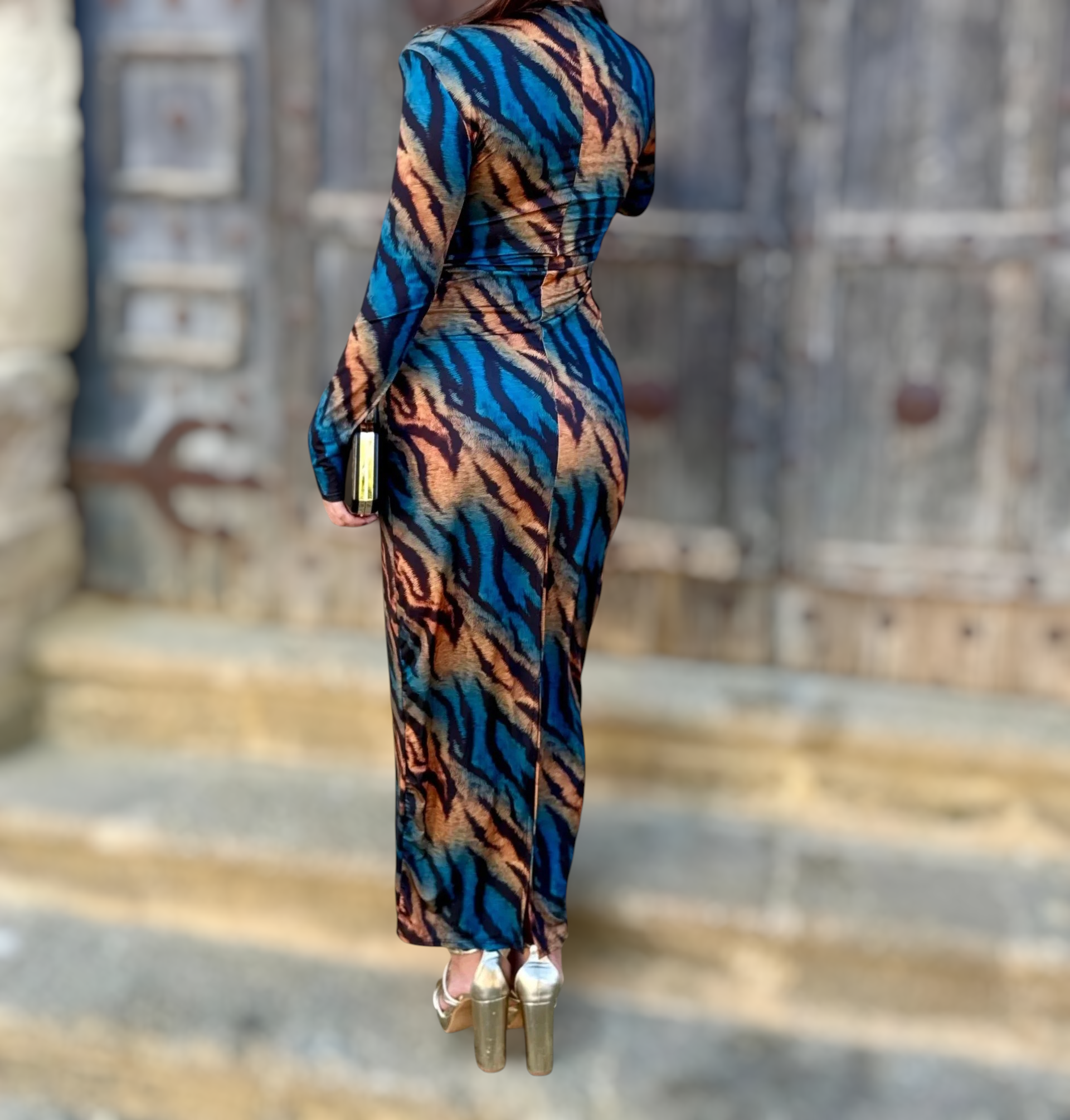 El diseño presenta un escote cerrado y mangas largas, aportando equilibrio al conjunto y un aire refinado. El frunce lateral en la cintura estiliza la silueta, realzando la figura con elegancia y naturalidad. Además, su largo midi y la caída fluida del tejido lo convierten en una opción ideal para eventos tanto de día como de noche.