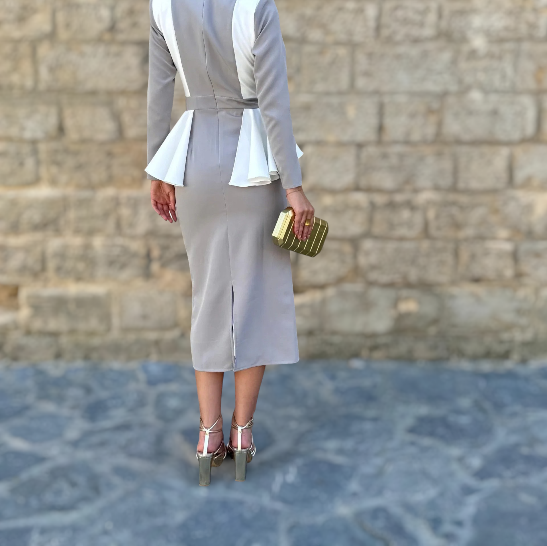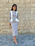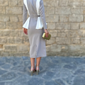 Confeccionado en un tejido con cuerpo y ligera elasticidad, se adapta perfectamente al cuerpo, marcando la cintura y estilizando la figura con naturalidad. El escote cerrado y las mangas largas equilibran el conjunto, aportando sobriedad y elegancia. Su corte midi lo convierte en una elección ideal tanto para eventos de día como de tarde.