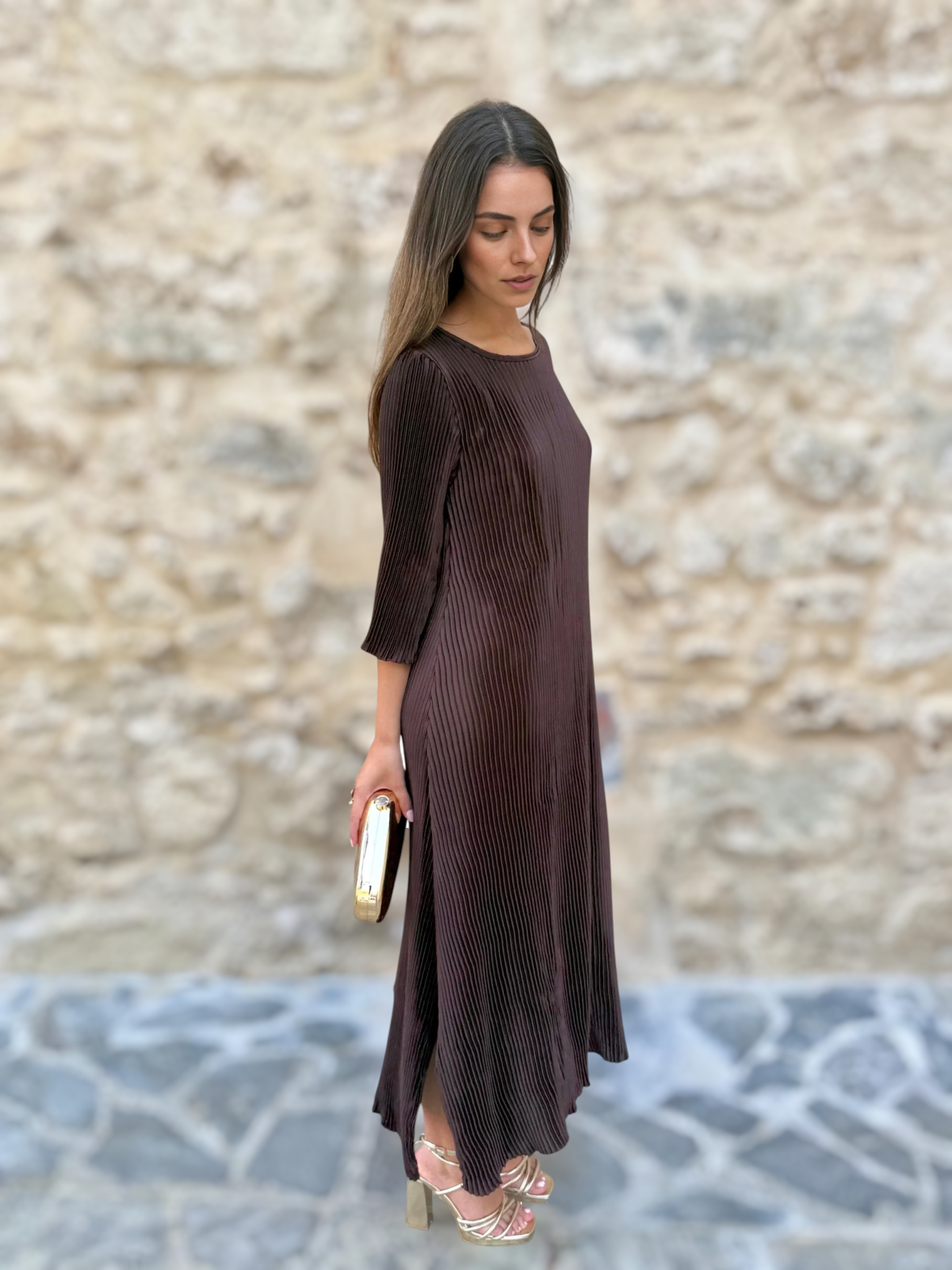 El Vestido Pilar Chocolate es una pieza que combina elegancia minimalista y comodidad sofisticada. Su tejido plisado de caída fluida aporta movimiento y un brillo sutil que realza la silueta con cada paso, mientras que el corte recto y ligero favorece todo tipo de figuras.