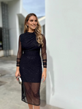 Confeccionado en un tejido semitransparente con destellos sutiles, envuelve el cuerpo con una caída ligera que aporta movimiento y luminosidad. Las mangas largas y el forro interior del mismo tono equilibran el conjunto, ofreciendo comodidad sin renunciar al glamour.