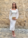 El Vestido Romina es una prenda de elegancia serena y silueta estructurada que combina clasicismo y modernidad en equilibrio perfecto. Su escote cuadrado aporta un aire sofisticado y realza el cuello y los hombros, mientras que el corte entallado define la figura con sutileza y armonía.