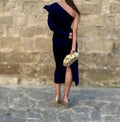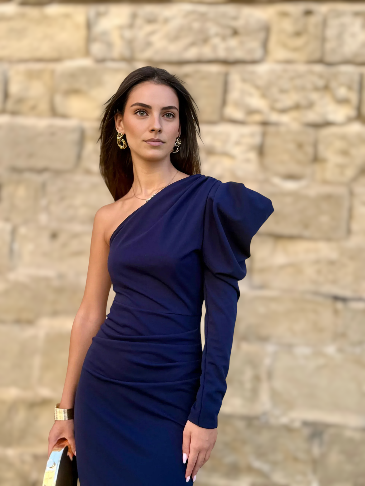 El Vestido Rosario Azul Marino es una pieza elegante y sofisticada que destaca por su silueta asimétrica y su corte impecable. Su escote de un solo hombro aporta un toque moderno y sensual, mientras que el drapeado lateral estiliza la figura y realza la feminidad con sutileza.