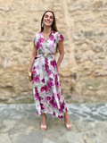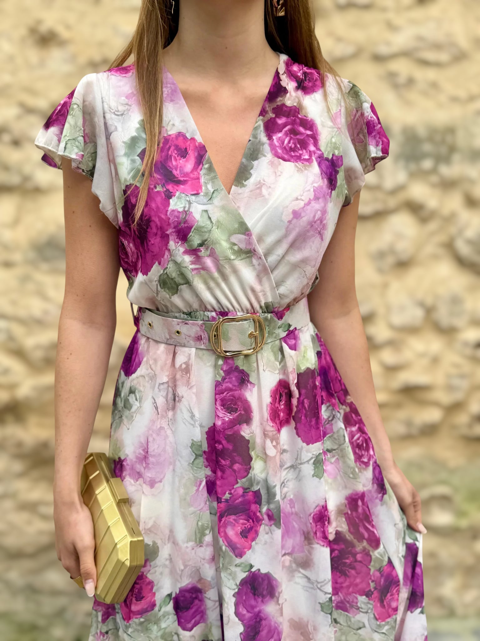 Con un escote cruzado en pico que realza el busto y estiliza el cuello, y unas mangas cortas con caída fluida, este diseño aporta movimiento y ligereza. El cinturón ajustable define la cintura, creando una silueta armoniosa y favorecedora.
