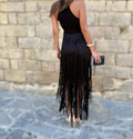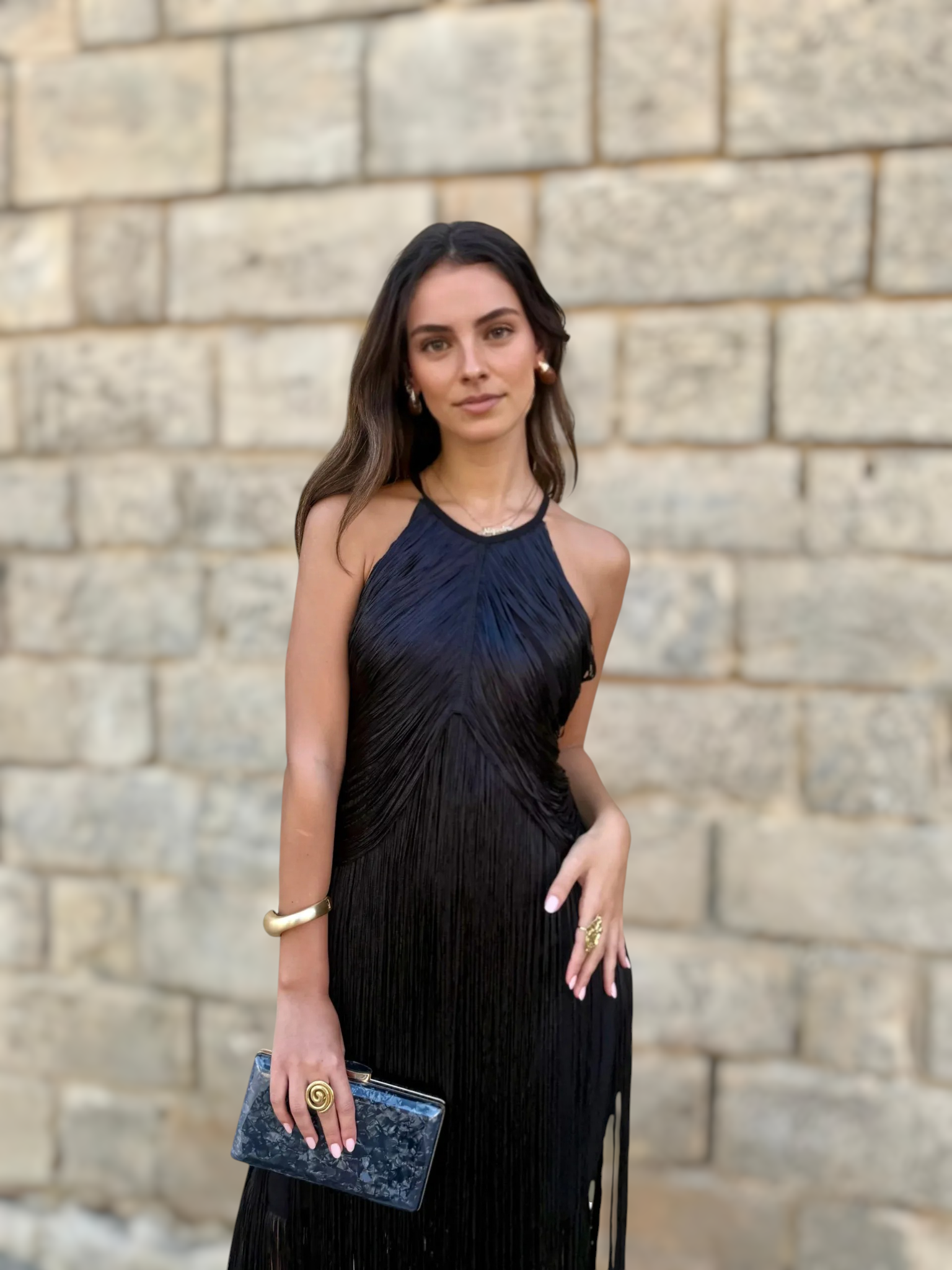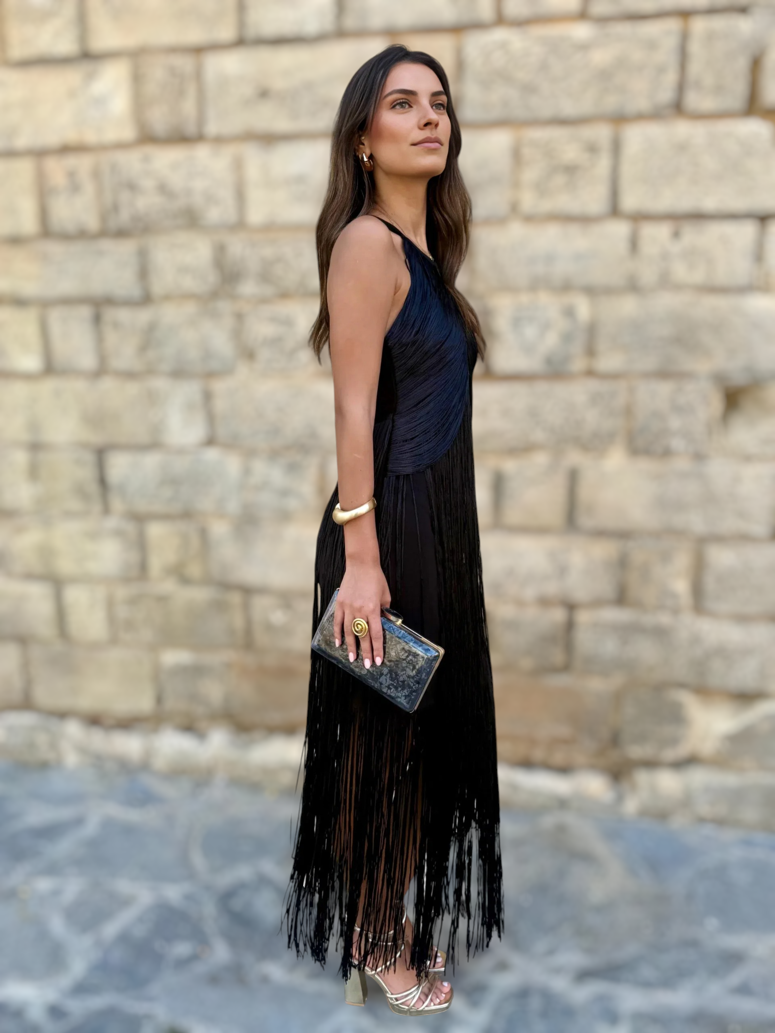 El Vestido Samara es una pieza de gran personalidad que combina movimiento, elegancia y un aire contemporáneo inconfundible. Su diseño de tirantes finos y silueta recta realza la figura con sutileza, mientras que la superposición de flecos largos aporta dinamismo y una presencia sofisticada.