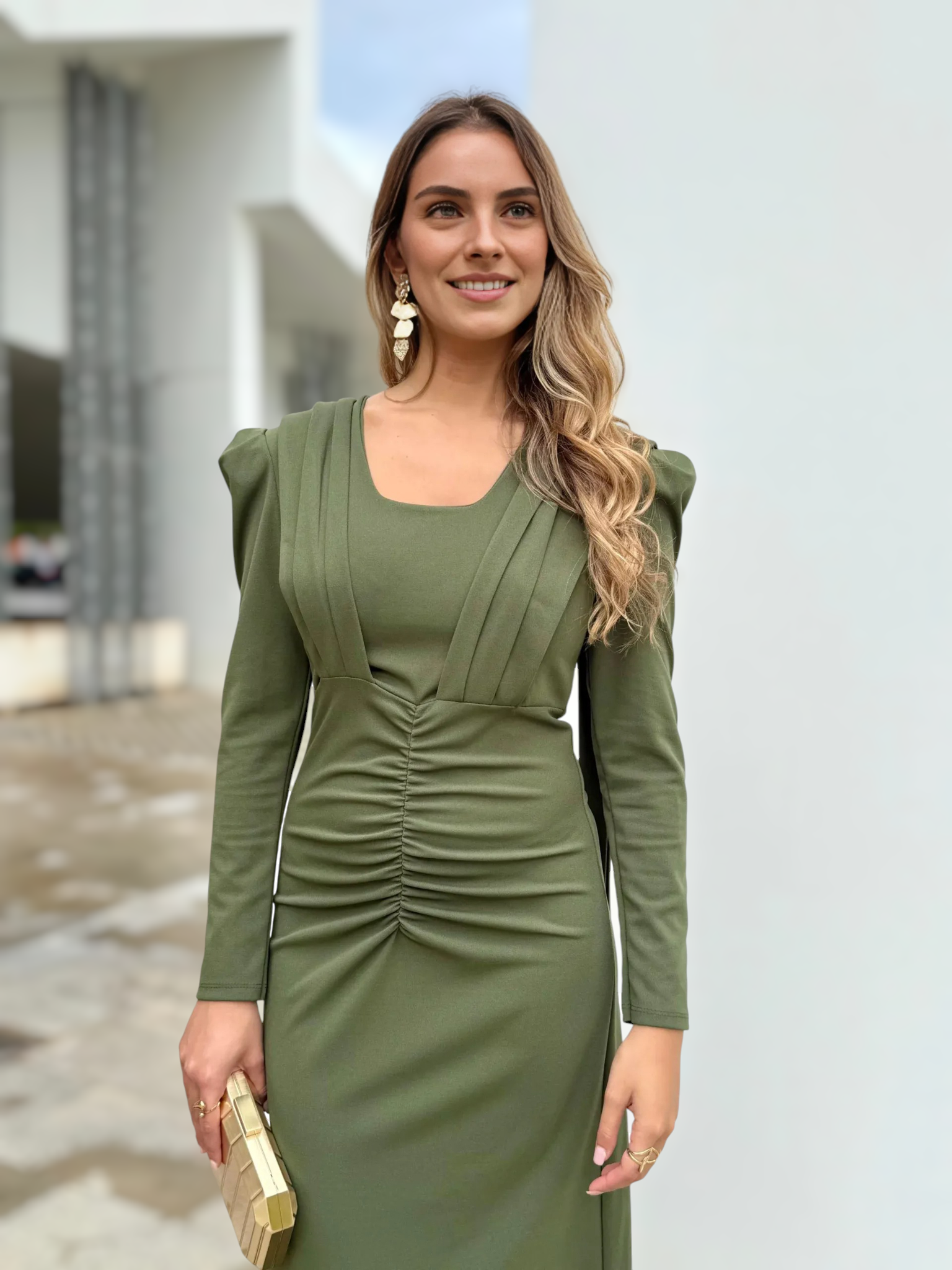 El Vestido María Verde es una prenda sofisticada y elegante que combina estructura y feminidad en un diseño atemporal. Su escote cuadrado enmarca el rostro con sutileza, mientras que el frunce central define la cintura y estiliza la silueta, aportando dinamismo y equilibrio al conjunto.