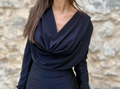 El Vestido Teresa Negro es una prenda que encarna la elegancia clásica con un toque de sensualidad refinada. Su escote drapeado aporta movimiento y sofisticación, mientras que el corte entallado resalta la figura con sutileza, creando una silueta femenina y armoniosa.