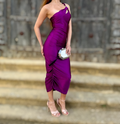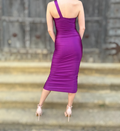 El Vestido Triana Morado es una pieza sofisticada que combina elegancia y sensualidad en un diseño asimétrico y contemporáneo. Su escote de un solo hombro con detalle metálico en el tirante aporta un toque original y moderno, mientras que su corte entallado realza la silueta con delicadeza.
