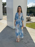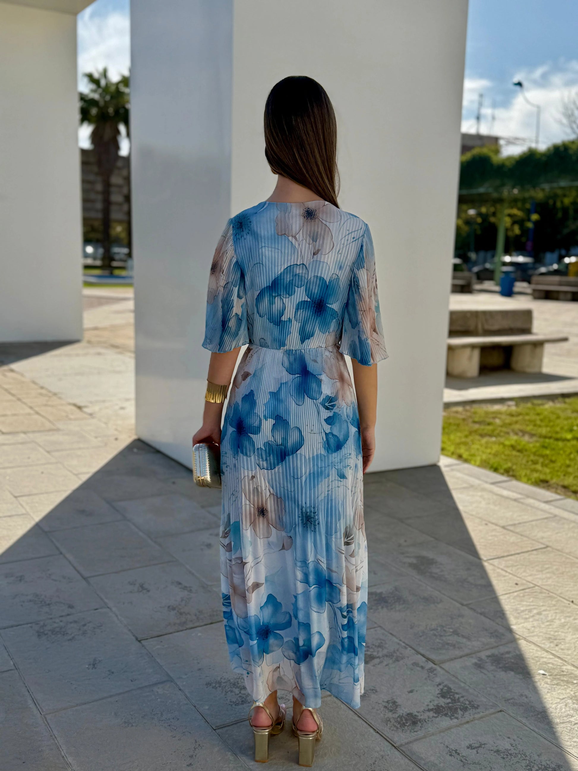 La falda de largo midi con acabado plisado estiliza la figura y aporta un aire romántico y sofisticado. Su diseño estampado refuerza esa sensación de frescura y suavidad, convirtiéndolo en un vestido cómodo, refinado y perfecto para lucir con naturalidad en ocasiones especiales.