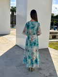 La falda de largo midi con acabado plisado estiliza la figura y aporta un aire romántico y sofisticado. Su diseño estampado refuerza esa sensación de frescura y suavidad, convirtiéndolo en un vestido cómodo, refinado y perfecto para lucir con naturalidad en ocasiones especiales.