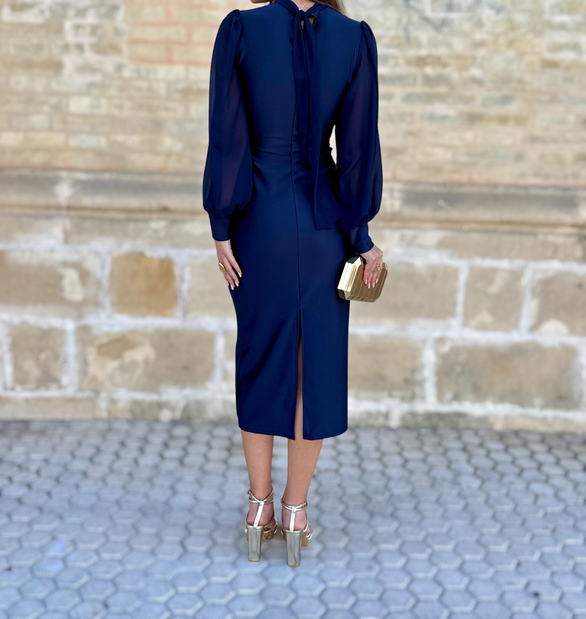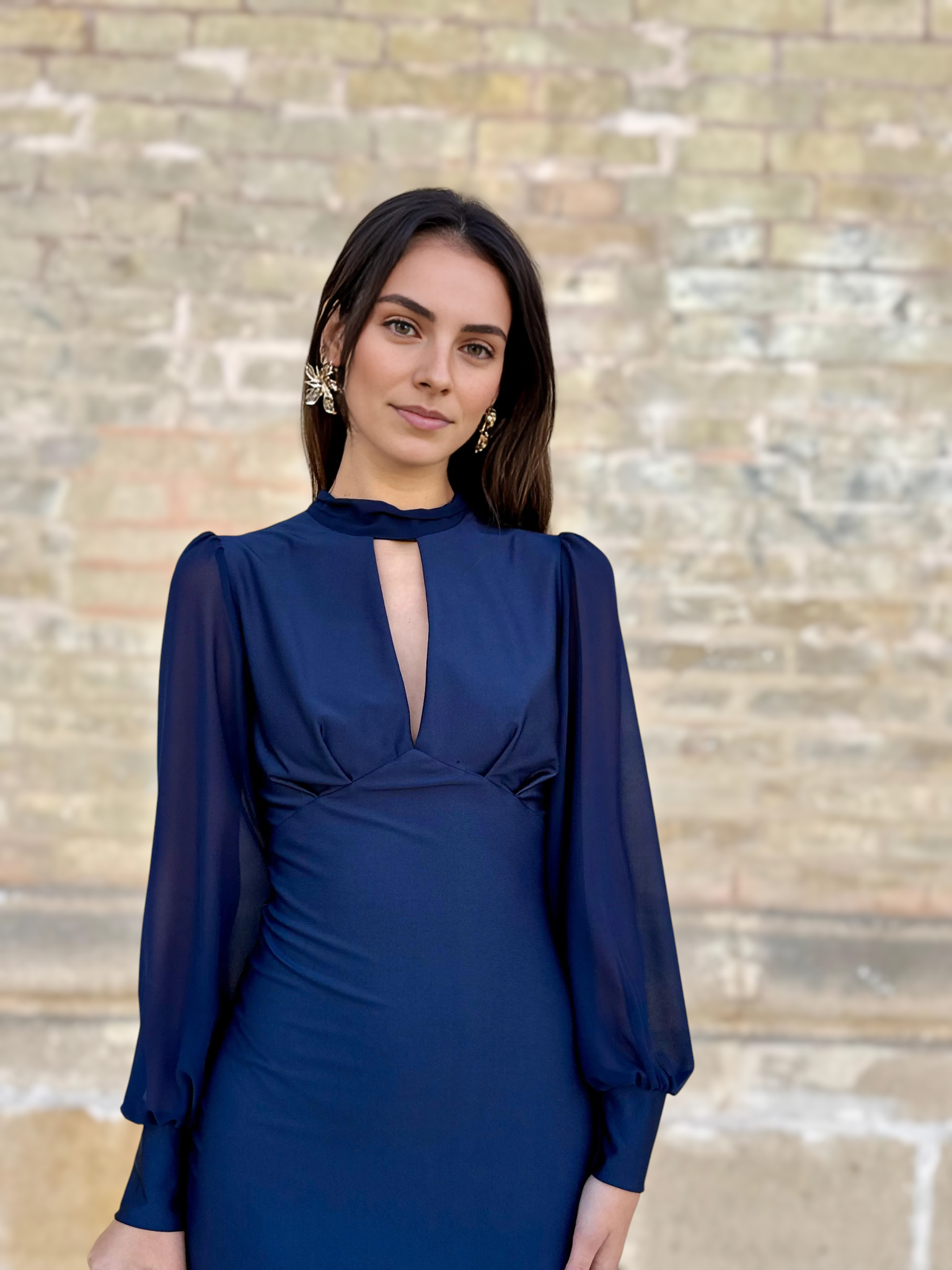 El Vestido Valeria es una prenda sofisticada y femenina que destaca por su diseño estructurado y su elegancia atemporal. Su escote en pico con abertura central añade un toque de sensualidad equilibrada, mientras que el cuello alto y las mangas largas abullonadas aportan un aire refinado y distinguido.