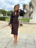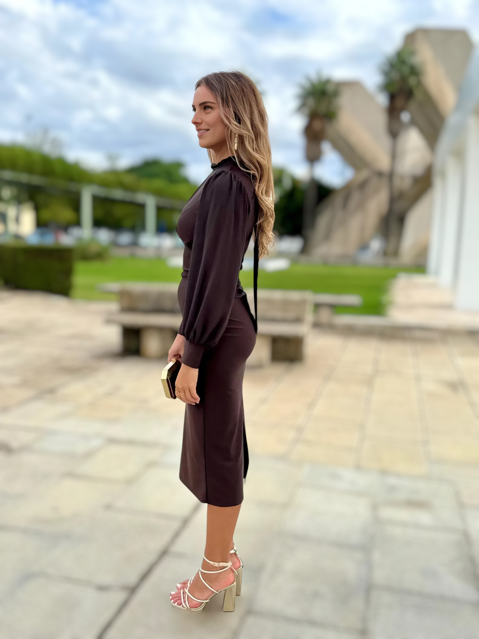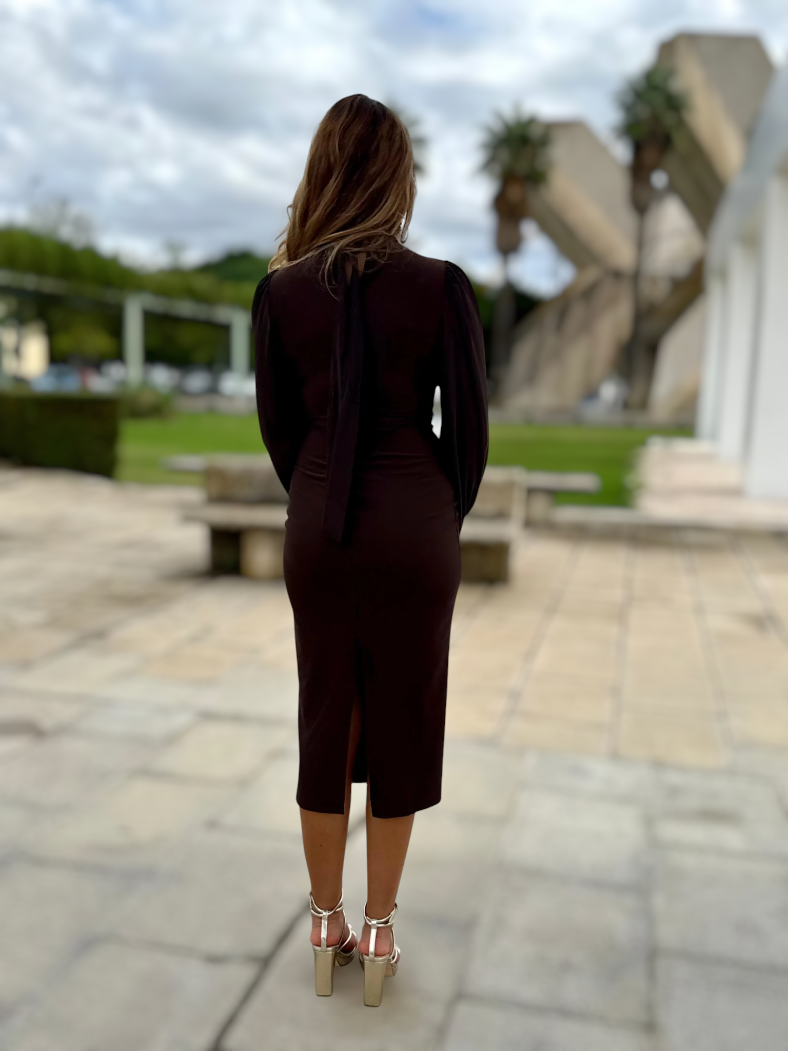 El Vestido Valeria es una prenda sofisticada y femenina que destaca por su diseño estructurado y su elegancia atemporal. Su escote en pico con abertura central añade un toque de sensualidad equilibrada, mientras que el cuello alto y las mangas largas abullonadas aportan un aire refinado y distinguido.