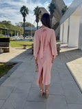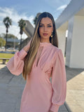El Vestido Valeria es una prenda sofisticada y femenina que destaca por su diseño estructurado y su elegancia atemporal. Su escote en pico con abertura central añade un toque de sensualidad equilibrada, mientras que el cuello alto y las mangas largas abullonadas aportan un aire refinado y distinguido.