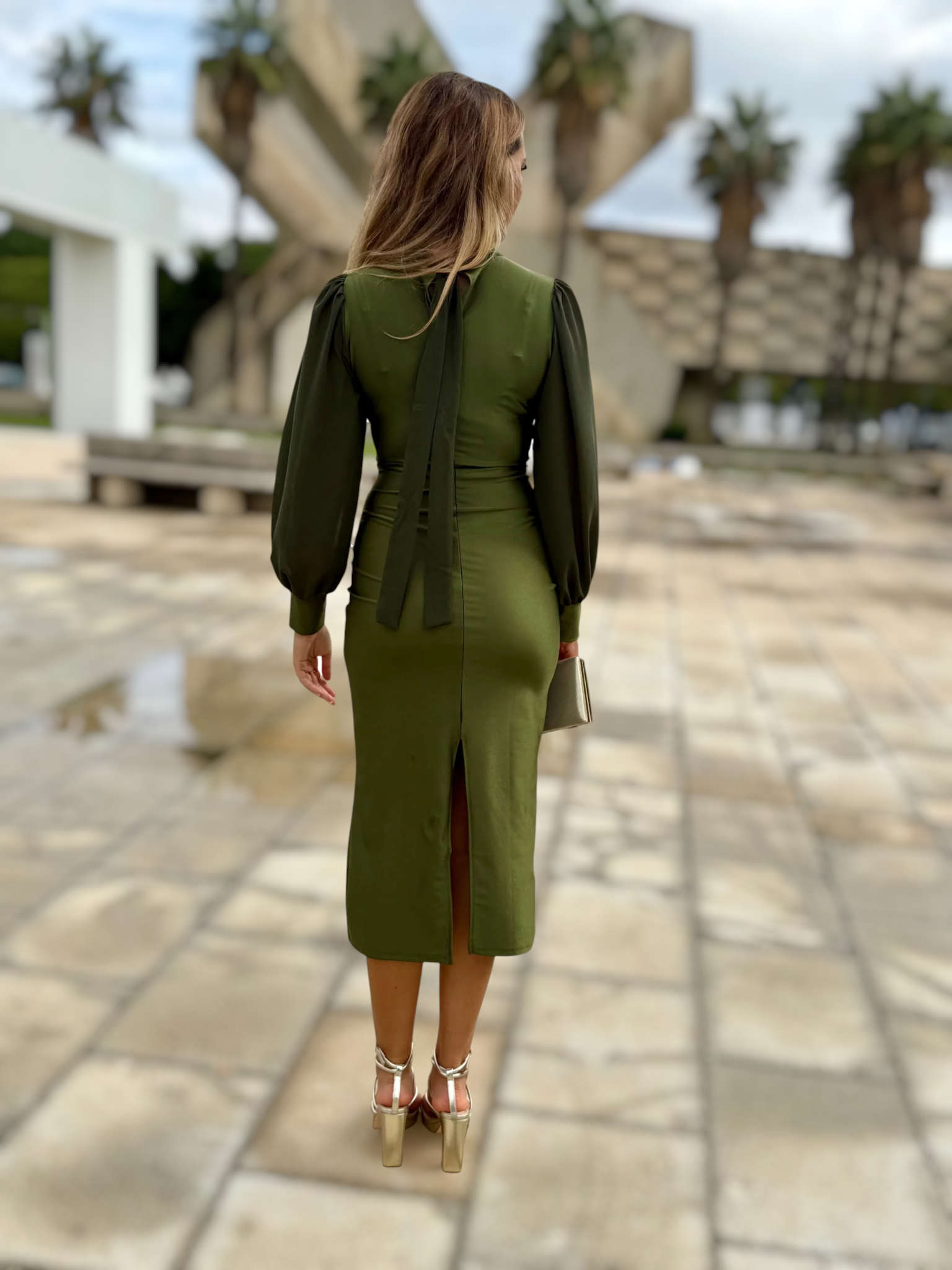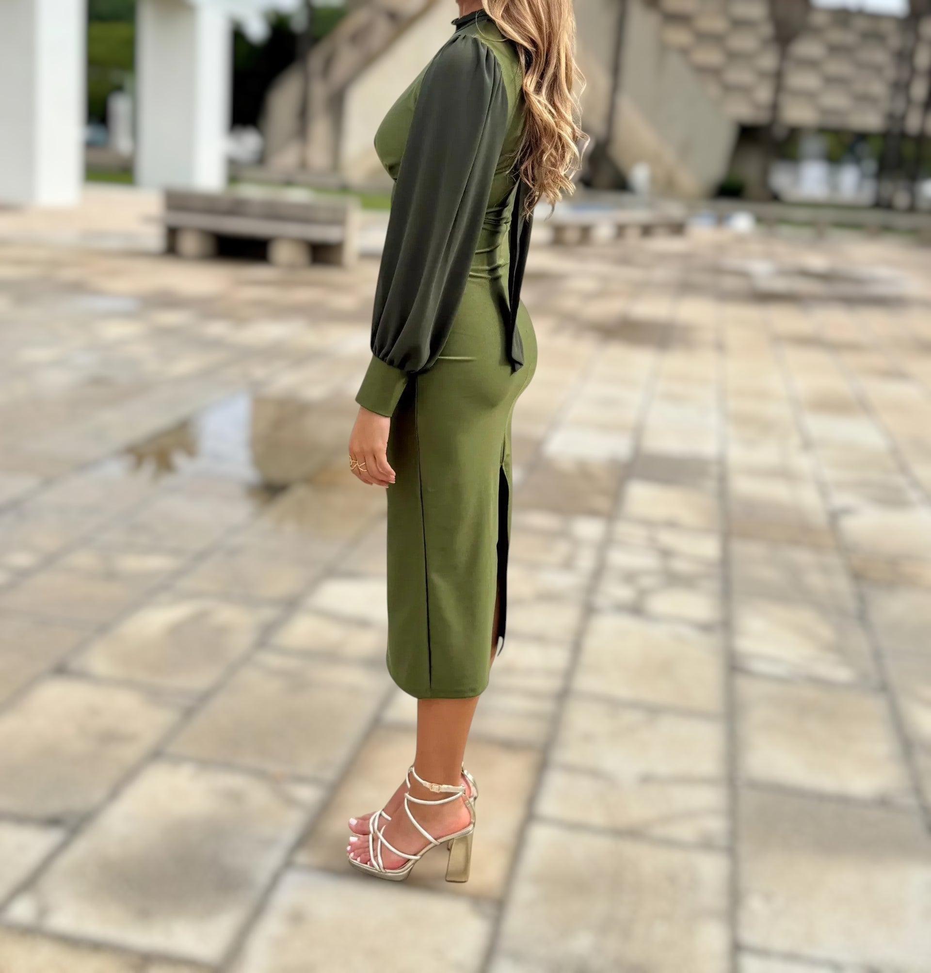 El Vestido Valeria es una prenda sofisticada y femenina que destaca por su diseño estructurado y su elegancia atemporal. Su escote en pico con abertura central añade un toque de sensualidad equilibrada, mientras que el cuello alto y las mangas largas abullonadas aportan un aire refinado y distinguido.