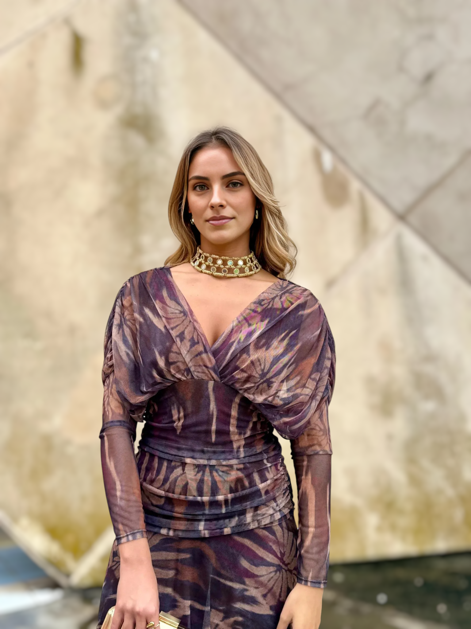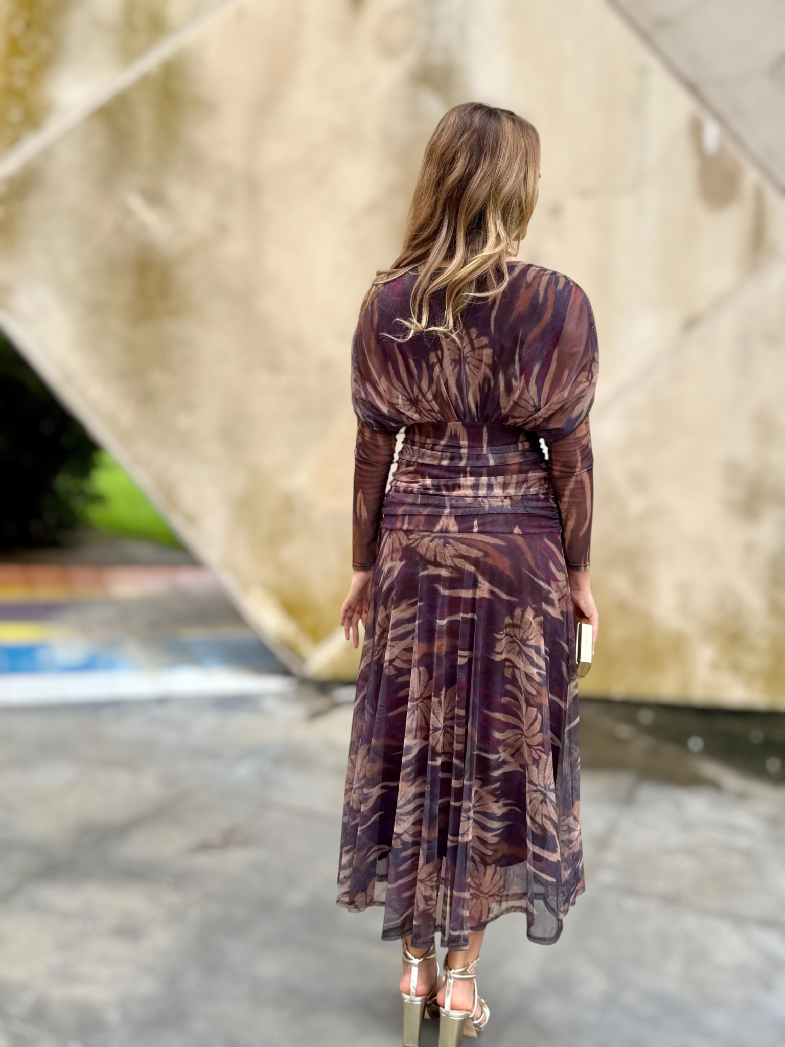 Confeccionado en un tejido vaporoso y ligero, este diseño se distingue por su estampado en tonos marrón, que aporta luminosidad y un aire sofisticado. Su falda midi con vuelo añade dinamismo y feminidad, perfecta para acompañar el movimiento con gracia.